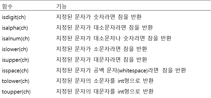 <cctype> 헤더파일에는 문자를 테스트하고 변환하는 몇가지의 함수가 포함되어 있다.