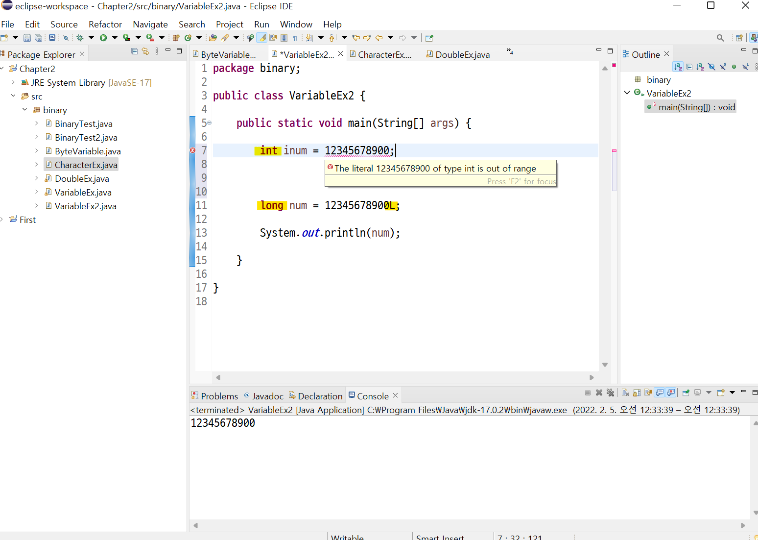 자료형의 크기에 상관없이 숫자 자체를 저장하는 것은 기본적으로 4byte이다. int형에 12345678900을 저장한다면 out of range라는 경고문이 뜬다. 그럴 때는, 자료형을 더 큰 long으로 바꿔준다. 하지만 12345678900은 4byte를 넘기 때문에 숫자 뒤에 L을 붙여서 8byte에 리터럴을 저장하라고 말해주어야 한다. (L은 long타입의 리터럴 타입 접미사(literal type suffix)이다.