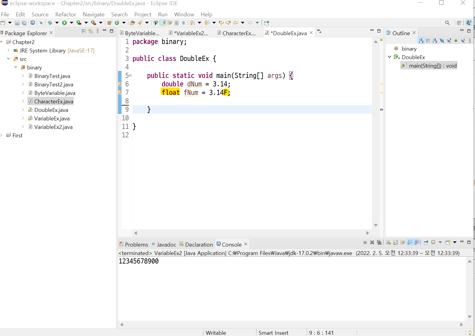 아래 코드와 같이 float형은 리터럴 타입 접미사를 붙여 float형이라는 것을 알려야 한다. double형은 생략이 가능하다.( 실수형 타입 중 기본이 되는 타입이 double형이기 때문인 것 같다.)