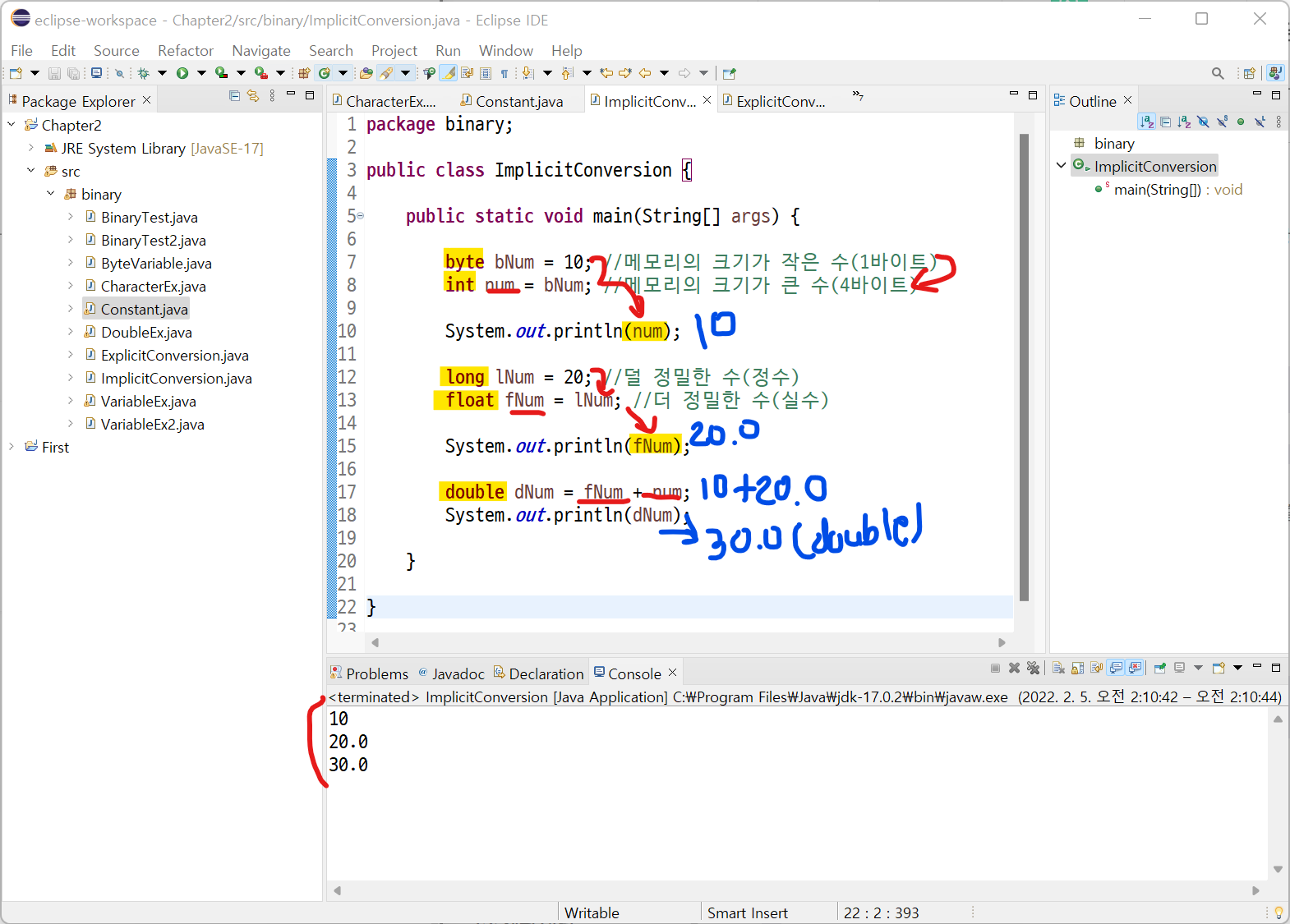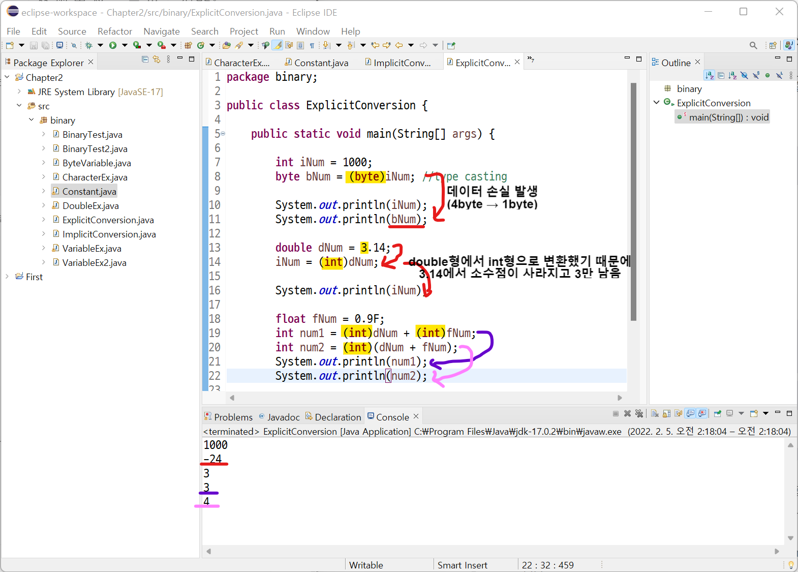 ✔️형(타입) 변환 type conversion : 하나의 타입을 다른 타입으로 바꾸는 것. 자바에서는 boolean형을 제외한 나머지 기본 타입 간의 타입 변환을 자유롭게 수행할 수 있다. 자료형은 각각 사용하는 메모리 크기와 방식이 다르기 때문에 서로 다른 자료형의 값이 대입되는 경우에 형 변환이 일어난다.