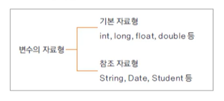 참조 자료형(reference data type) : 자바 라이브러리에서 제공되는 자료형들(String 등)과 직접 만들어서 사용하는 자료형(Student, Date 등)이 있다. 클래스가 변수의 자료형이 되는 것이다.