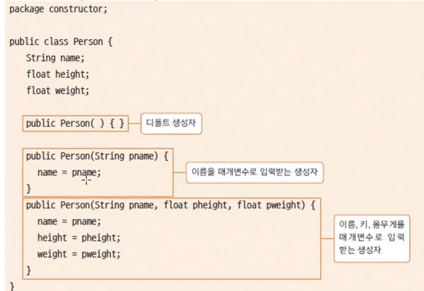 - 생성자는 메소드가 아니다. 상속되지 않으며, 리턴값이 없다.