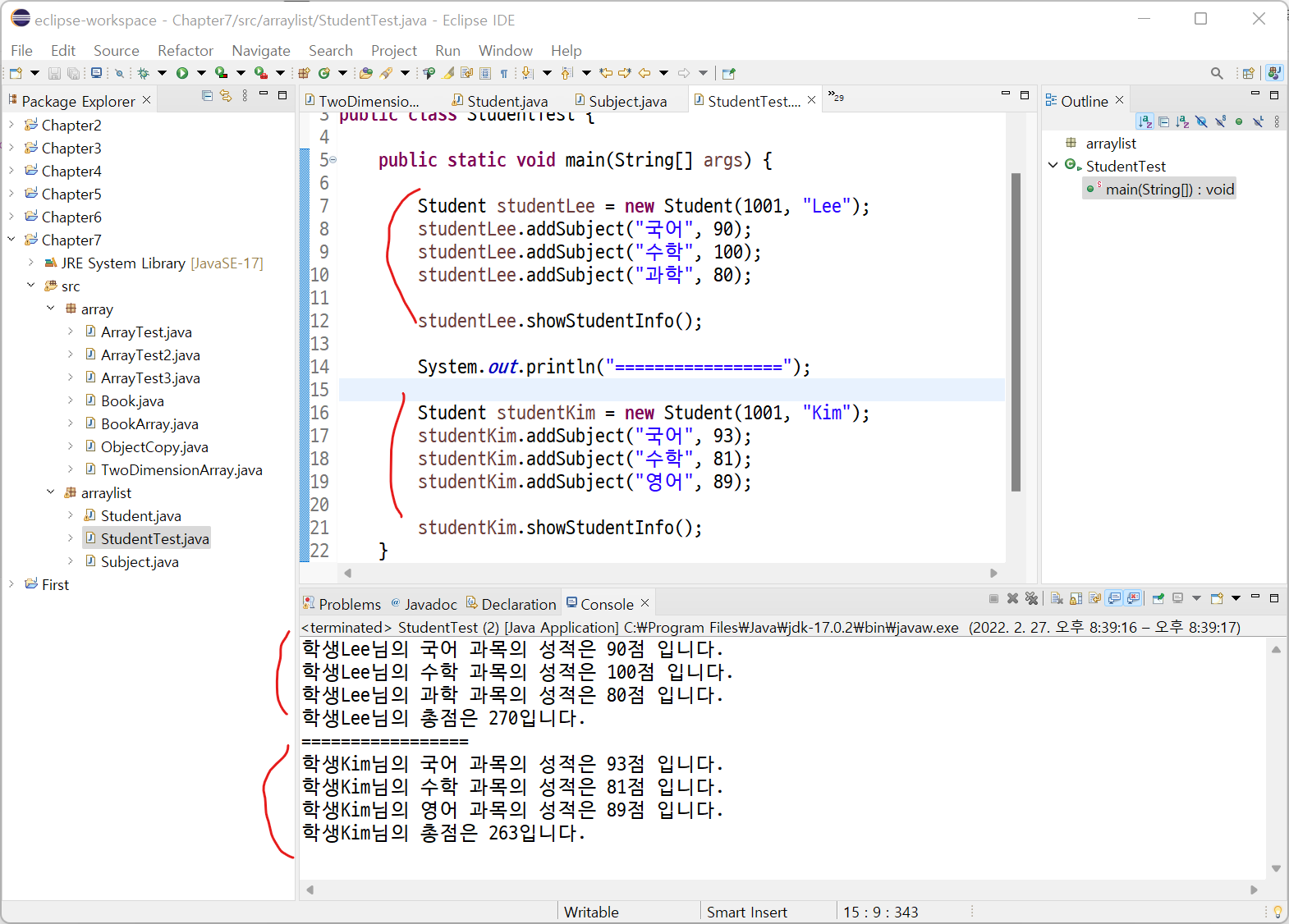 System.out.println("학생" + studentName + "님의 총점은 " + total + "입니다.");
