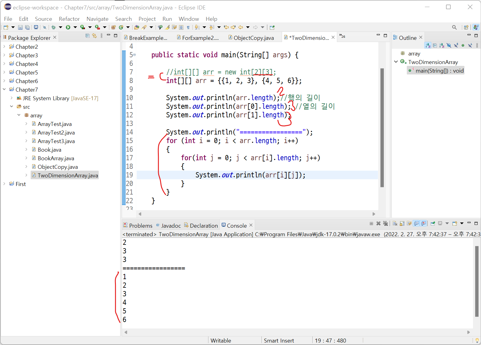 int[][] arr = new int[2][3]; //행 개수, 열 개수