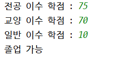 09. 대학을 졸업하려면 최소 140학점을 이수해야 한다고 하자. 이수한 학점 중 전공은 70학점 이상이어야 하며, 교양과 일반은 각각 30학점 이상이거나 두 영역이 80학점 이상이어야 한다. 이수한 세 개의 학점을 각각 키보드로 입력받아 졸업 여부를 출력하는 프로그램을 작성하라.