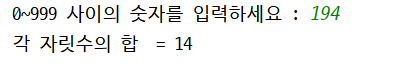 08. 키보드로 0부터 999 사이의 정수를 입력받아 각 자릿수를 더한 결과를 출력하는 프로그램을 작성하라.